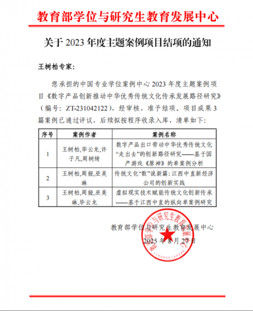 近日,教育部学位与研究生教育发展中心传来喜讯——日本三级片王树柏老师主持的中国专业学位案例中心2023年度主题案例项目《数字产品创新推动中华优秀传统文化传承发展路径研究》(编号:ZT-231042122),经专家审核准予结项,项目成果已通过评议并拟按程序收录入库。